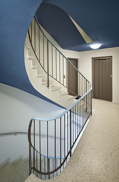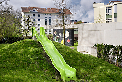 Nicht nur den Wohnungen verpassten wir partiell ein neues Kleid. Auch das Treppenhaus erhielt einen neuen Anstrich und eine sanfte Renovation, nach unserem Konzept. Dass hier auch für die Kleinen etwas Neues entstehen durfte, freut uns ganz besonders. Der neue Spielplatz wird über die neuen gedeckten Aussenparkplätze mit einer Treppe erschlossen. Auf dem Dach der Parkplätze bis zum Ufer des Houelbachs entstand ein Aussenraum, der naturnah bepflanzt ist. Hier gedeihen auch Sträucher mit Beeren, die man pflücken darf. Der Spielplatz ist ein wahres Paradies: Raumbildende gebaute Elemente zonieren den Spielplatz und mutieren zu Spielgeräten. Eine organisch geformte Kletterwand mit verschiedenen Funktionen dient als Wandtafel, als Kugelbahn oder sogar als Fussballtor. Flusssteine laden zum Steinmandli-Bauen ein und bilden die Verbindung zum Bach.